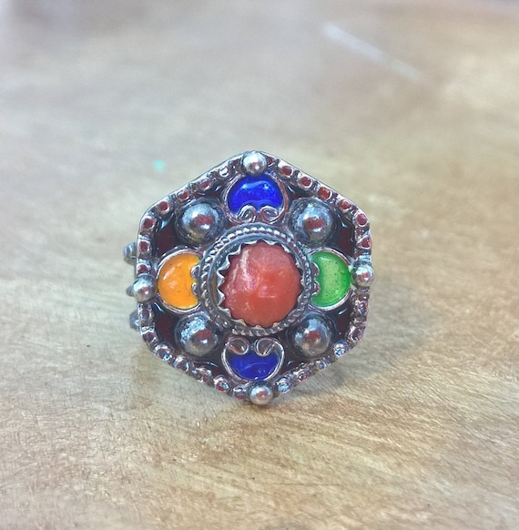 Bague Kabyle Berbere En Argent Corail Et Couleurs Emailles
